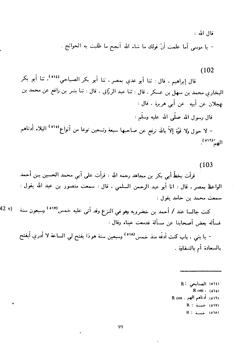 101 - أخبرنا قاسم بن محمد: أنا إبراهيم بن محمد: ثنا ابن مفرج: ثنا محمد بن أيوب الرقي: ثنا عمارة بن وثيمة، قال: ثنا أبي، قال يحيى بن سليمان المكي، عن سعيد بن صبيح، قال: بلغني أن موسى عليه السلام كانت له إلى الله حاجة، فطلبها إلى الله عز وجل وألح عليه فيها، فأبطأت عليه، فقال: «ما شاء الله» .