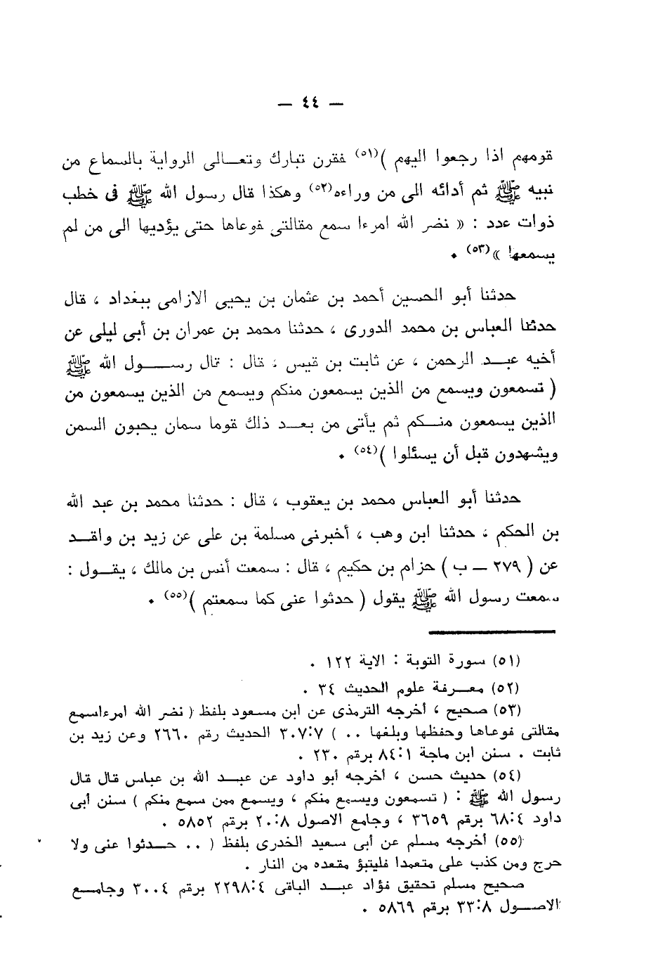 قومهم اذا رجعوا اليهم فَقَرَنَ تَبَارَكَ وَتَعَالَى الرِّوَايَةَ بِالسَّمَاعِ مِنْ نَبِيِّهِ صَلَّى اللَّهُ عَلَيْهِ وَسَلَّمَ ثُمَّ أَدَائِهِ إِلَى مَنْ وَرَاءهُ وَهَكَذَا قَالَ رَسُولُ اللَّهِ صَلَّى اللَّهُ عَلَيْهِ وَسَلَّمَ فِي خُطَبٍ ذَوَاتِ عَدَدٍ نَضَّرَ اللَّهُ امراء سَمِعَ مَقَالَتِي فَوَعَاهَا حَتَّى يُؤَدِّيهَا إِلَى مَنْ لَمْ يَسْمَعْهَا