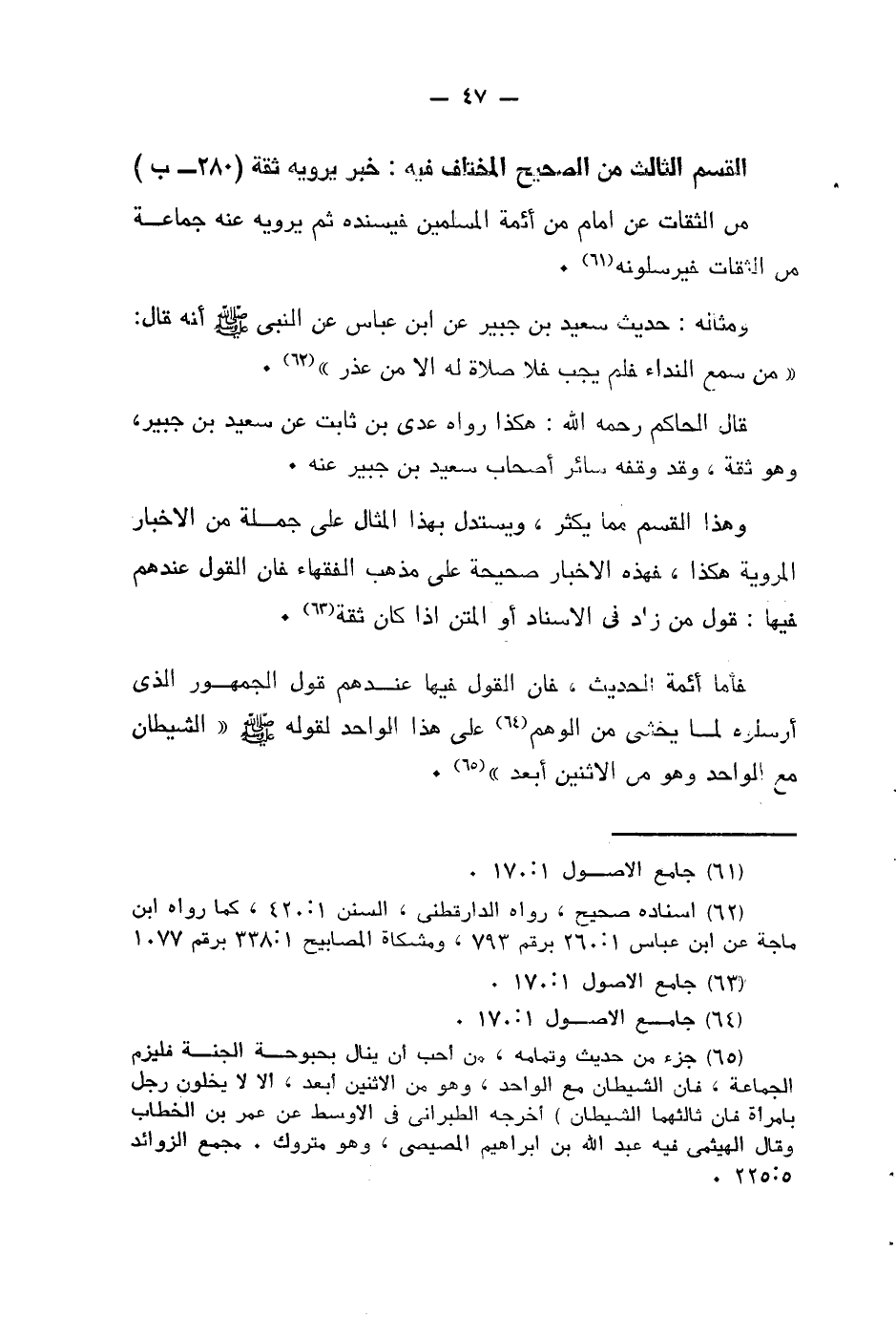 الْقِسْمُ الثَّالِثُ مِنَ الصَّحِيحِ الْمُخْتَلَفِ فِيهِ خبر يَرْوِيهِ ثِقَةٌ مِنَ الثِّقَاتِ عَنْ إِمَامٍ مِنْ أَئِمَّةِ الْمُسْلِمِينَ فَيُسْنِدُهُ ثُمَّ يَرْوِيهِ عَنْهُ جَمَاعَةٌ مِنَ الثِّقَاتِ فَيُرْسِلُونَهُ وَمِثَالُهُ حَدِيثُ سَعِيدِ بْنِ جُبَيْرٍ عَنِ ابْنِ عَبَّاسٍ عَنِ النَّبِيِّ صَلَّى اللَّهُ عَلَيْهِ وَسَلَّمَ أَنَّهُ قَالَ مَنْ سَمِعَ النِّدَاءَ فَلَمْ يَجِبْ فَلَا صَلَاةَ لَهُ إِلَّا مِنْ عُذْرٍ