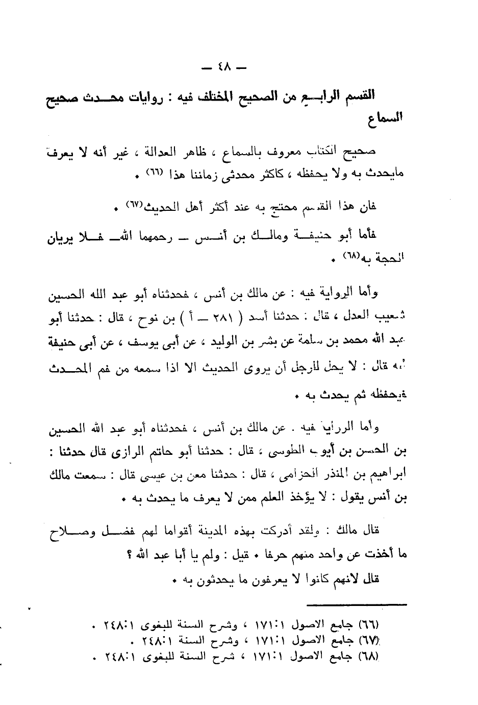 الْقِسْمُ الرَّابِعُ مِنَ الصَّحِيحِ الْمُخْتَلَفِ فِيهِ رِوَايَاتُ مُحدث صَحِيحِ السَّمَاعِ صَحِيحِ الْكِتَابِ مَعْرُوفٍ بِالسَّمَاعِ ظَاهِرِ الْعَدَالَةِ غَيْرَ أَنَّهُ لَا يَعْرِفُ مَا يُحدث بِهِ وَلَا يَحْفَظُهُ كَأَكْثَرِ مُحدثي زَمَانِنَا هَذَا فَإِنَّ هَذَا الْقِسْمَ مُحْتَجٌّ بِهِ عِنْدَ أَكْثَرِ أَهْلِ الْحَدِيثِ فَأَمَّا أَبُو حَنِيفَةَ وَمَالِكُ بْنُ أَنَسٍ رَحِمَهُمَا اللَّهُ فَلَا يَرَيَانِ الْحُجَّةَ بِهِ