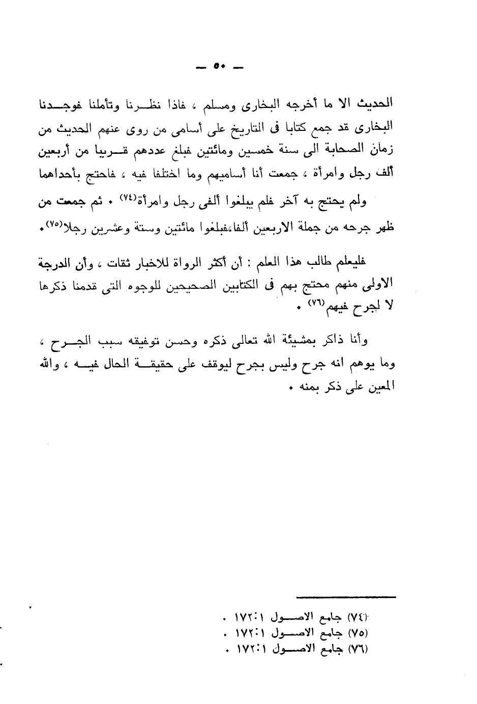 الْحَدِيثِ إِلَّا مَا أَخْرَجَهُ الْبُخَارِيُّ وَمُسْلِمٌ فَإِذَا نَظَرْنَا وَتَأَمَّلْنَا فَوَجَدْنَا الْبُخَارِيَّ قَدْ جَمَعَ كِتَابًا فِي التَّارِيخِ عَلَى أَسَامِي مَنْ رُوِيَ عَنْهُمُ الْحَدِيثُ مِنْ زَمَانِ الصَّحَابَةِ إِلَى سَنَةِ خَمْسِينَ وَمِائَتَيْنِ فَبَلَغَ عَدَدُهُمْ قَرِيبًا مِنْ أَرْبَعِينَ أَلْفَ رَجُلٍ وَامْرَأَةٍ جَمَعْتُ أَنَا أَسَامِيهِمْ وما اختلفا فيه فاحتج بأحداهما وَلَمْ يَحْتَجُّ بِهِ آخَرُ فَلَمْ يَبْلُغُوا أَلْفَيْ رَجُلٍ وَامْرَأَةٍ ثُمَّ جَمَعْتُ مَنْ ظَهَرَ جَرْحُهُ مِنْ جُمْلَةِ الْأَرْبَعِينَ أَلْفًا فَبَلَغُوا مِائَتَيْنِ وستة وَعِشْرِينَ رَجُلًا
