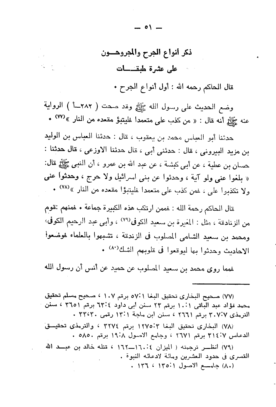 قَالَ الْحَاكِمُ رَحِمَهُ اللَّهُ أَوَّلُ أَنْوَاعِ الْجَرْحِ وَضْعُ الْحَدِيثِ عَلَى رَسُولِ اللَّهِ صَلَّى اللَّهُ عَلَيْهِ وَسَلَّمَ وَقَدْ صَحَّتِ الرِّوَايَةُ عَنْهُ صَلَّى اللَّهُ عَلَيْهِ وَسَلَّمَ أَنَّهُ قَالَ مَنْ كَذِبَ على متعمدا فليتبؤ مَقْعَدَهُ مِنَ النَّارِ