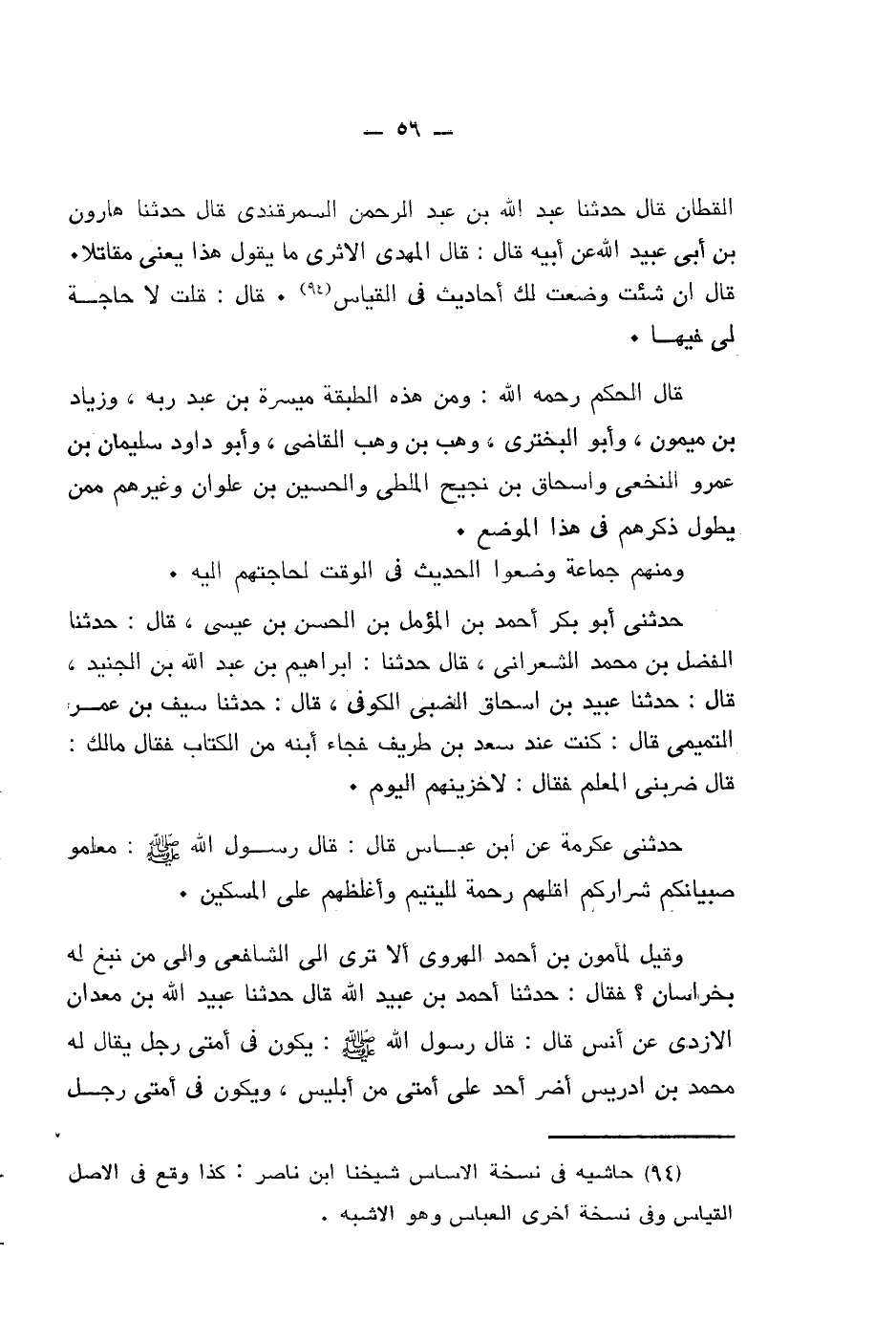 الْقَطَّانُ قَالَ حدثنَا عَبْدُ اللَّهِ بْنُ عَبْدِ الرَّحْمَنِ السَّمَرْقَنْدِيُّ قَالَ حدثنَا هَارُونُ بْنُ أَبِي عُبَيْدِ اللَّهِ عَنْ أَبِيهِ قَالَ قَالَ الَمَهْدِيُّ الْأَثْرِيُّ مَا يَقُولُ هَذَا يَعْنِي مُقَاتِلًا قَالَ إِنْ شِئْتَ وَضَعْتُ لَكَ أَحَادِيثَ فِي الْقِيَاسِ قَالَ قُلْتُ لَا حَاجَةَ لِي فِيهَا