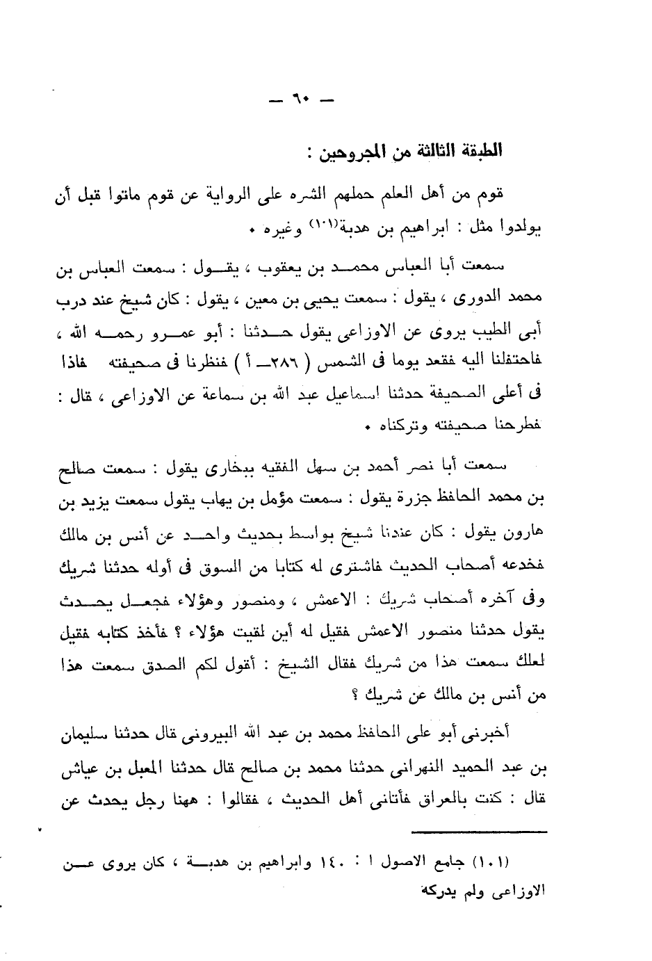 الطَّبَقَةُ الثَّالِثَةُ مِنَ الْمَجْرُوحِينَ قَوْمٌ من أهل العلم حملهمالشره عَلَى الرِّوَايَةِ عَنْ قَوْمٍ مَاتُوا قَبْلَ أَنْ يُولَدُوا مِثْلُ إِبْرَاهِيمَ بْنِ هُدْبَةَ وَغَيْرِهِ