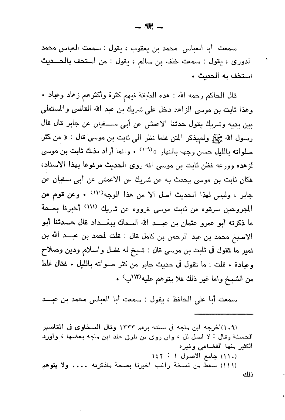 قَالَ الْحَاكِمُ رَحِمَهُ اللَّهُ هَذِهِ الطَّبَقَةُ فِيهِمْ كثرة وأكثرهم زهاد وعباد ونذا ثَابِتُ بْنُ مُوسَى الزَّاهِدُ دَخَلَ عَلَى شَرِيكِ بْنِ عَبْدِ اللَّهِ الْقَاضِي وَالْمُسْتَمْلِي بَيْنَ يَدَيْهِ وَشَرِيكٌ يَقُولُ حدثنَا الْأَعْمَشُ عَنْ أَبِي سُفْيَانَ عَنْ جَابِرٍ قَالَ قَالَ رسول الله صلى لله عَلَيْهِ وَسَلَّمَ وَلَمْ يَذْكُرِ الْمَتْنَ فَلَمَّا نَظَرَ إِلَى ثَابِتِ بْنِ مُوسَى قَالَ مَنْ كَثَّرَ صَلَوَاتِهِ بِاللَّيْلِ حَسُنَ وَجْهُهُ بِالنَّهَارِ وَإِنَّمَا أَرَادَ بِذَلِكَ ثَابِتَ بْنَ مُوسَى لِزُهْدِهِ وَوَرَعِهِ فَظَنَّ ثَابِتُ بْنُ مُوسَى أَنَّهُ رَوَى الْحَدِيثَ مَرْفُوعًا بِهَذَا الْإِسْنَادِ فَكَانَ ثَابِتُ بْنُ مُوسَى يُحدث بِهِ عَنْ شَرِيكٍ عَنِ الْأَعْمَشِ عَنْ أَبِي سُفْيَانَ عَنْ جَابِرٍ وَلَيْسَ لِهَذَا الْحَدِيثِ أَصْلٌ إِلَّا مِنْ هَذَا الْوَجْهِ وَعَنْ قَوْمٍ مِنَ الْمَجْرُوحِينَ سَرَقُوهُ من ثابت بن موسى فَرَوَوْهُ عَنْ شَرِيكٍ أَخبرنَا بِصِحَّةِ مَا ذَكَرْتُهُ أَبُو عَمْرٍو عُثْمَانُ بْنُ عَبْدِ اللَّهِ السَّمَّاكُ بِبَغْدَادَ قَالَ حدثنَا أَبُو الْأَصْبَغِ مُحَمَّدُ بْنُ عَبْدِ الرَّحْمَنِ بْنِ كَامِلٍ قَالَ قُلْتُ لِمُحَمَّدِ بْنِ عَبْدِ اللَّهِ بْنِ نُمَيْرٍ مَا تَقُولُ فِي ثَابِتِ بْنِ مُوسَى قَالَ شَيْخٌ لَهُ فَضْلٌ وَإِسْلَامٌ وَدِينٌ وصلاح وعبادة قلت ماتقول فى حديث جابر م كَثَّرَ صَلَوَاتِهِ بِاللَّيْلِ فَقَالَ غَلَطٌ مِنَ الشَّيْخِ وَأَمَّا غَيْرُ ذَلِكَ فَلَا يُتَوَهَّمُ عَلَيْهِ