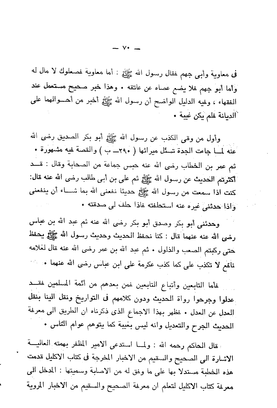 فأما التابعين وَأَتْبَاعُ التَّابِعِينَ فَمَنْ بَعْدَهُمْ مِنْ أَئِمَّةِ الْمُسْلِمِينَ فَقَدْ عَدَّلُوا وَجَرَّحُوا رُوَاةَ الْحَدِيثِ وَدُوِّنَ كَلَامُهُمْ فِي التَّوَارِيخِ وَنُقِلَ إِلَيْنَا بِنَقْلِ الْعَدْلِ عَنِ الْعَدْلِ فَظَهَرَ بِهَذَا الْإِجْمَاعِ الَّذِي ذَكَرْنَاهُ أَنَّ الطَّرِيقَ إِلَى مَعْرِفَةِ الْحَدِيثِ الْجَرْحُ وَالتَّعْدِيلُ وَأَنَّهُ لَيْسَ بِغَيْبَةٍ كَمَا يَتَوَهَّمُ عَوَامُّ النَّاسِ