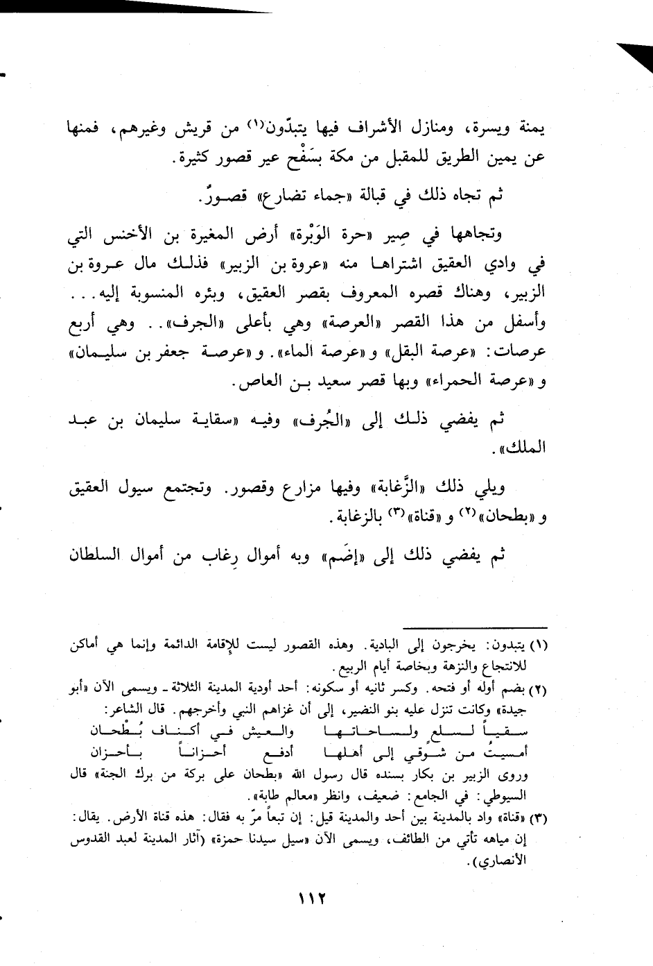 يمنة و يسرة، ومنازل الأشراف فيها يتبدون (1) من قريش وغيرهم، فمنها عن يمين الطريق للمقبل من مكة بسفح عير قصور كثيرة.