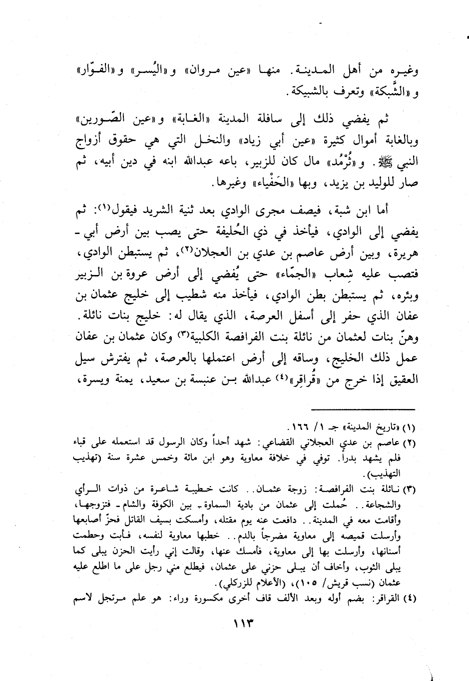 وهن بنات لعثمان بن نائلة بنت الفرافصة الكلبية (3) وكان عثمان بن عفان عمل ذلك الخليج، وساقه إلى أرض اعتملها بالعرصة، ثم يفترش سيل العقيق إذا خرج من ((قُراقر)) (4) عبد الله بن عنبسة بن سعيد، يمنة ويسرة، ...