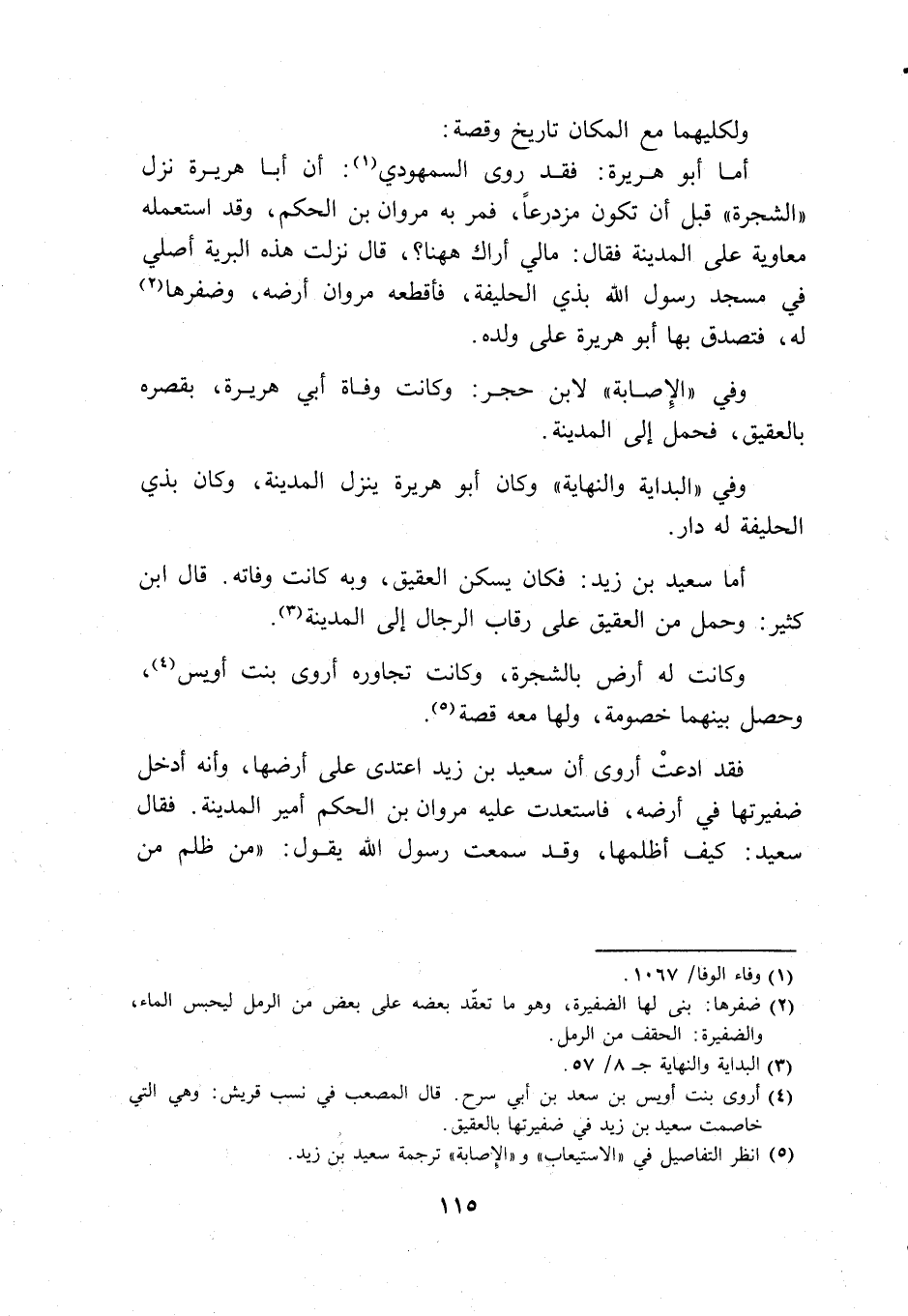 ولكليهما مع المكان تاريخ وقصة: أما أبو هريرة: فقد روى السمهودي (1): إن أبا هريرة نزل ((الشجرة)) قبل أن تكون مزدرعاً، فمر به مروان بن الحكم، وقد استعمله معاوية على المدينة فقال: مالي اراك ههنا؟، قال نزلت هذه البرية اصلى في مسجد رسول الله بذي الحليفة، فأقطعه مروان أرضه، وظفرها (2) له، فتصدق بها أبو هريرة على ولده.