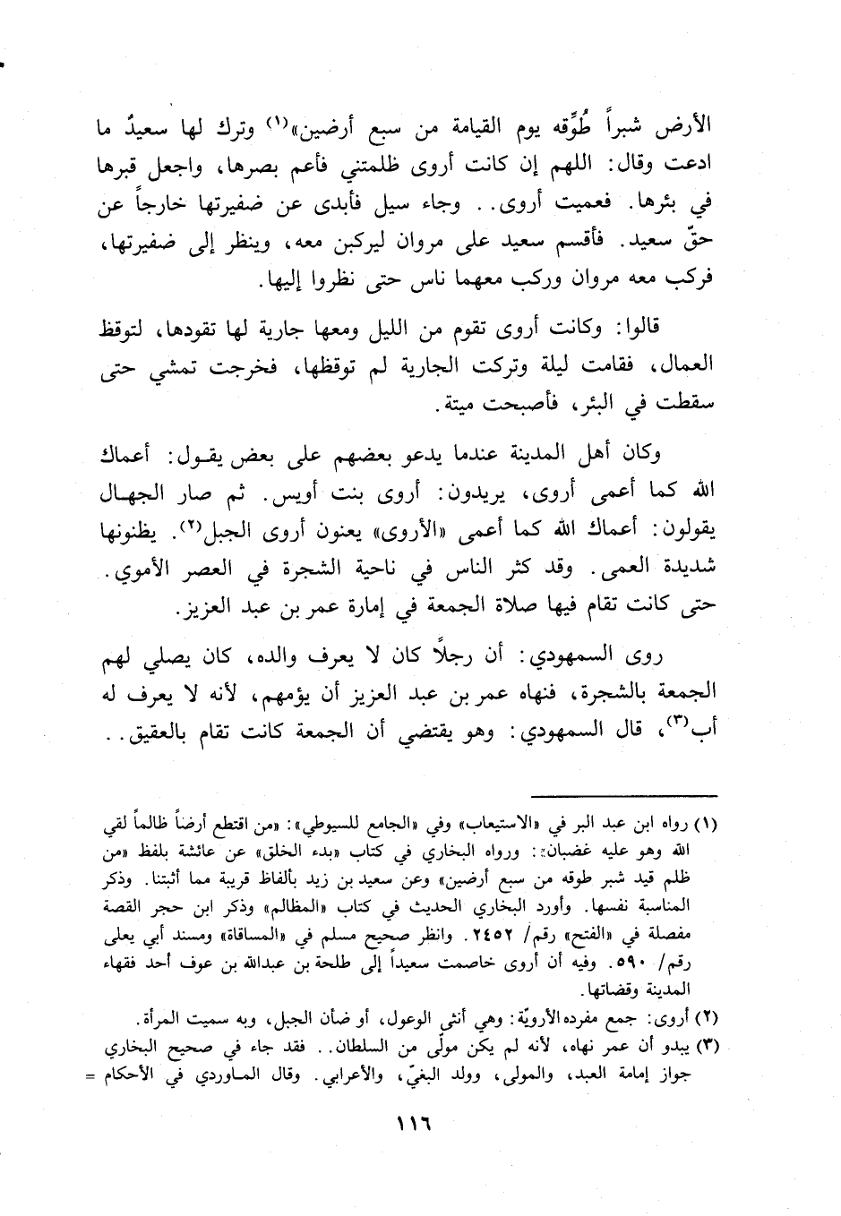 (1) رواه ابن عبد البر في ((الإستيعاب)) وفي ((الجامع للسيوطي)): ((من اقتطع أرضاً ظالماً لقي الله وهو عليه غضبان: رواه البخاري في كتاب ((بدء الخلق)) عن عائشة بلفظ ((من ظلم قيد شبر طوقه من سبع أرضين)) وعن سعيد بن زيد بألفاظ قريبة مما أثبتنا. وذكر المناسبة نفسها. وأوردالبخاري الحديث في كتاب ((المظالم)) وذكر ابن حجر القصة مفصلة في ((الفتح)) رقم /2452. وانظر صحيح مسلم في ((المساقاة)) ومسند أبي يعلى رقم /590. وفيه أن أروى خاصمت سعيداً إلى طلحة بن عبد الله بن عوف أحد فقهاء المدينة وقضاتها.