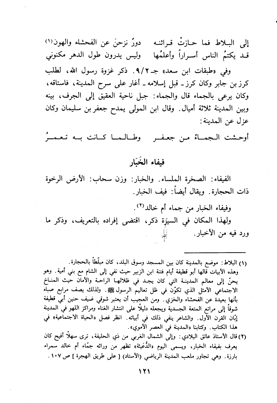 (2) قال الأستاذ عاتق البلادي: وإلى الشمال الغربي من ذي الحليفة، ترى سهلاً أفيح كان يعرف بفيفاء الخبار، ويسمى اليوم ((الدعيثة)) تظهر من ورائه جماء أم خالد سمراء بارزة. وهي تجاور ملعب المدينة الرياضي ((الأستاد)) [على طريق الهجرة] ص 107.