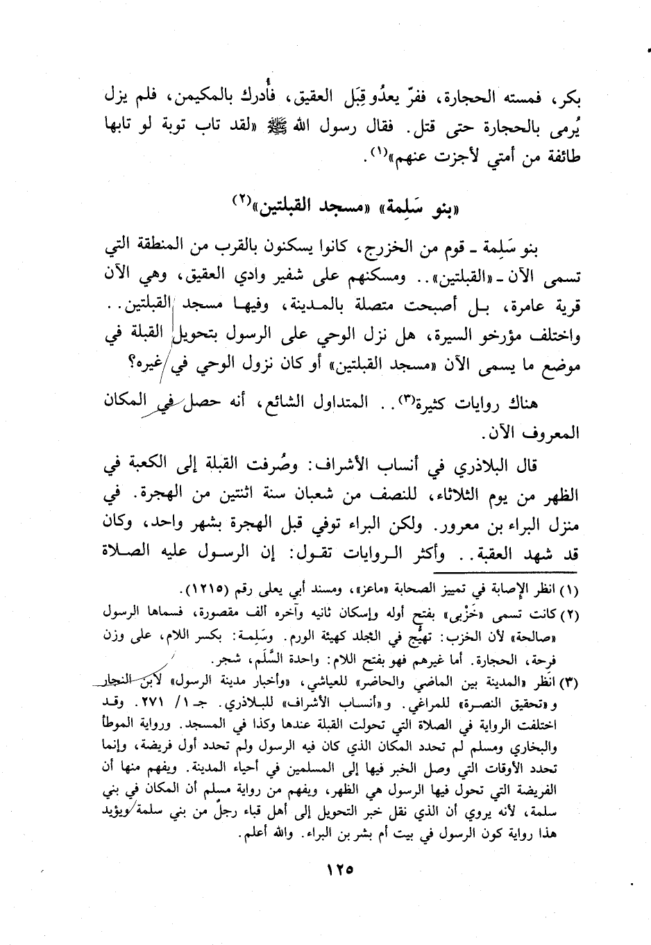 بنو سلمة _ قوم من الخزرج، كانو يسكنون بالقرب من المنطقة التي تسمى الآن _ ((القبلتين)) .. ومسكنهم على شفير وادي العقيق، وهي الآن قرية عامرة، بل أصبحت متصلة بالمدينة، وفيها مسجد القبلتين .. واختلف مؤرخو السيرة، هل نزل الوحي على الرسول بتحويل القبلة في موضع ما يسمى الآن ((مسجد القبلتين)) أو كان نزول الوحي في غيره؟ هناك روايات كثيرة (3) .. المتداول الشائع، إنه حصل في المكان المعروف الآن.
