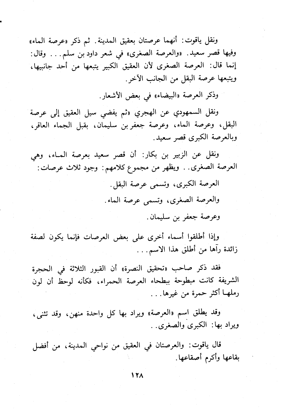 وقال: إنما قال: العرصة الصغرى لأن العقيق الكبير يتبعها من أحد جانبيها، ويتبعها عرصة البقل من الجانب الآخر.
