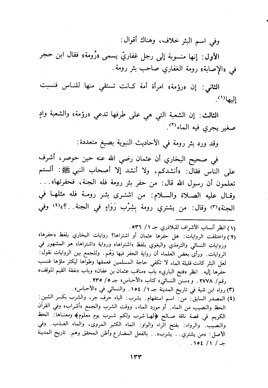 (2) واختلفت الروايات: هل حفرها عثمان أو اشتراها؟ روايات البخاري بلفظ ((حفرها)) وروايات النسائي والترمذي والبغوي بلفظ ((اشتراها)) ورواية ((اشتراها)) هو المشهور في الروايات. ورأى بعض العلماء أن رواية الحفر فيها وهم. وللجمع بين الروايات نقول: لعل البئر كانت قليلة الماء لاتكفي حاجة المسلمين فعمقها وطواها ليكثر ماؤها فنسب حفرها إليه. انظر ((فتح الباري)) باب ((مناقب عثمان بن عفان)) وباب ((نفقة القيم للوقف)) رقم/2778. و ((سنن النسائي)) كتاب ((الأحباس)) جـ 235/ 5.