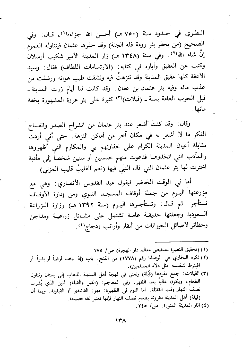 الطبري في حدود سنة (750 هـ) أحسن الله جزاءه (1)، قال: وفي الصحيح (من يحفر بئر رومة فله الجنة) وقد حفرها عثمان فيتناوله العموم إن شاء الله (2).
