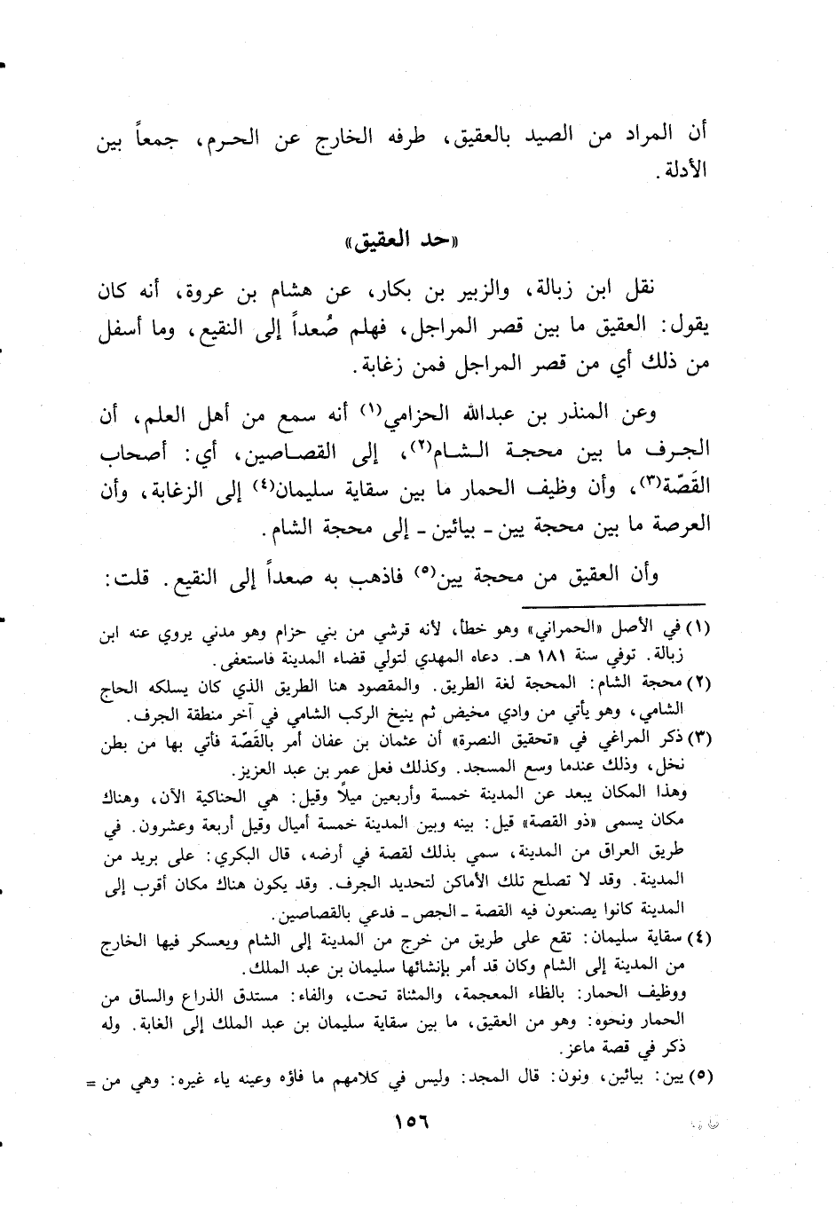 وعن المنذر بن عبد الله الحزامي (1) أنه سمع من أهل العلم، أن الجرف ما بين محجة الشام (2)، إلى القصاصين، أي: أصحاب القصة (3)، وأن وظيف الحمار ما بين سقاية سليمان (4) إلى الزغابة، وأن العرصة ما بين محجة يين _ بيائين _ إلى محجة الشام.