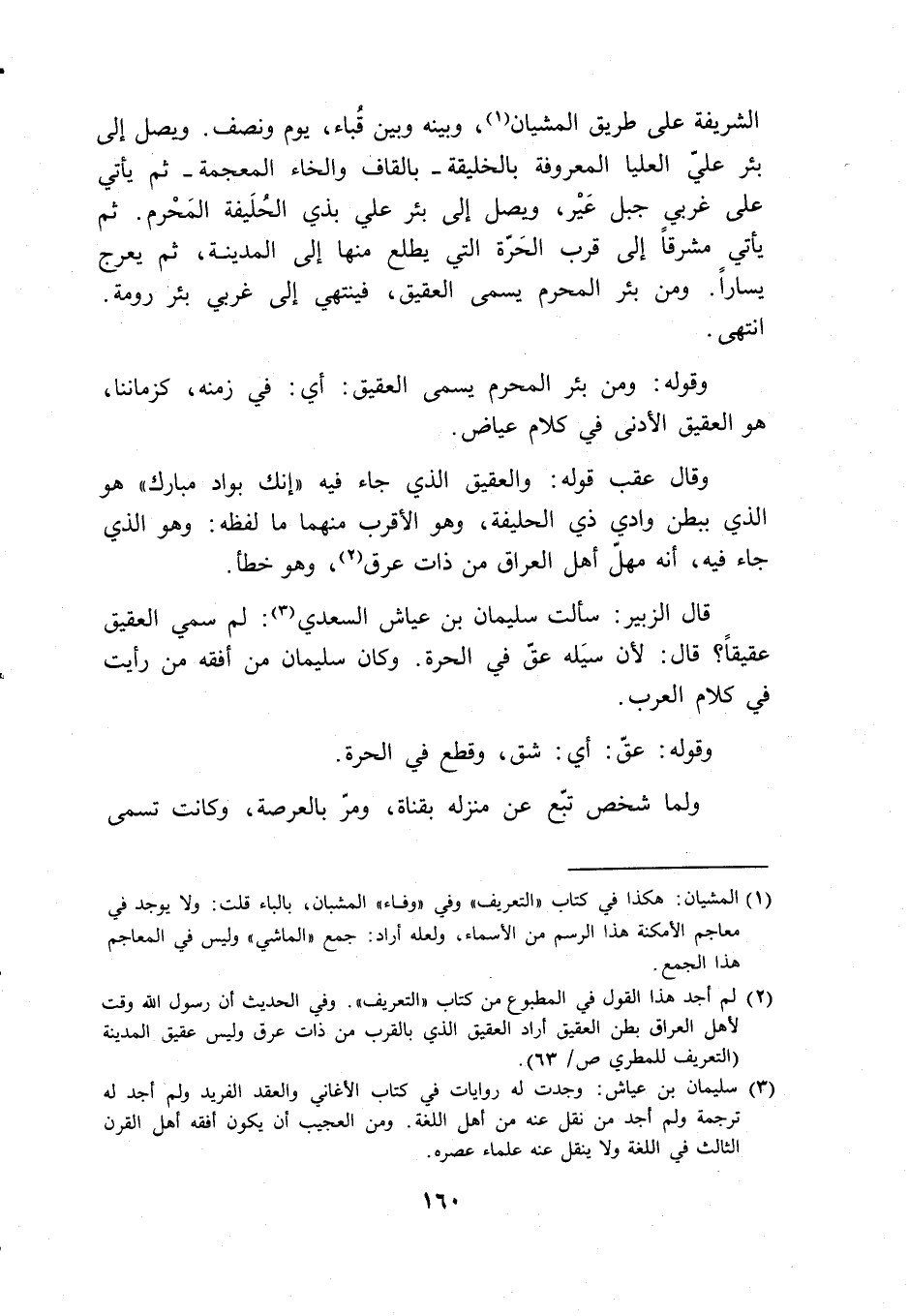 (1) المشيان: هكذا في كتاب ((التعريف)) وفي ((وفاء)) المشبان، بالباء قلت: ولا يوجد في معاجم الأمكنة هذا الرسم من الأسماء، ولعله اراد: جمع ((الماشي)) وليس في المعاجم هذا الجمع.