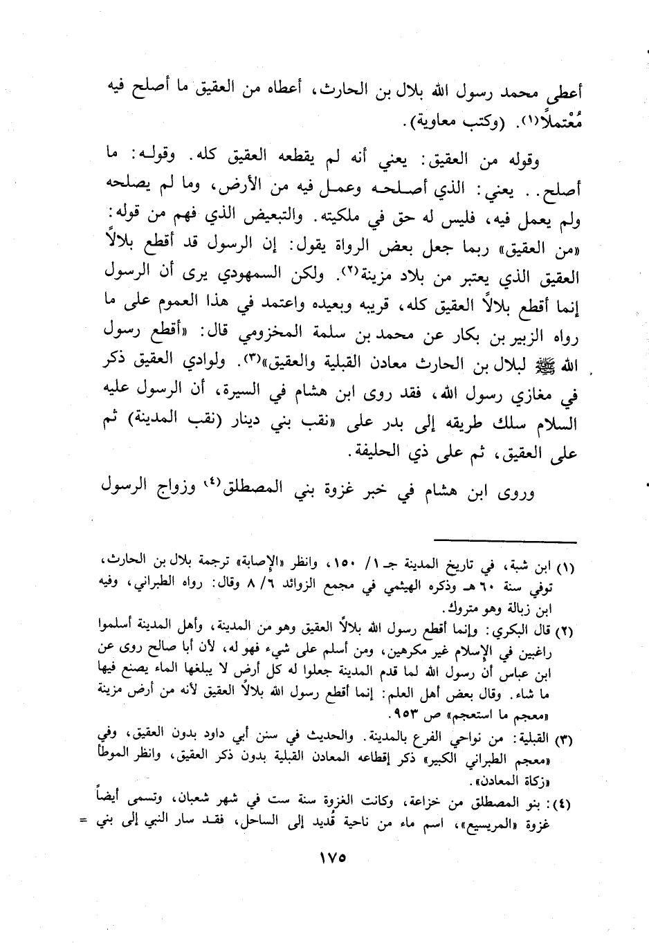 (2) قال البكري: وإنما أقطع رسول الله بلالاً العقيق وهو من المدينة، وأهل المدينة أسلموا راغبين في الإسلام غير مكرهين، ومن أسلم على شيء فهو له، لأن أبا صالح روى عن ابن عباس أن رسول الله لما قدم المدينة جعلوا له كل أرض لا يبلغها الماء يصنع فيها ما شاء.