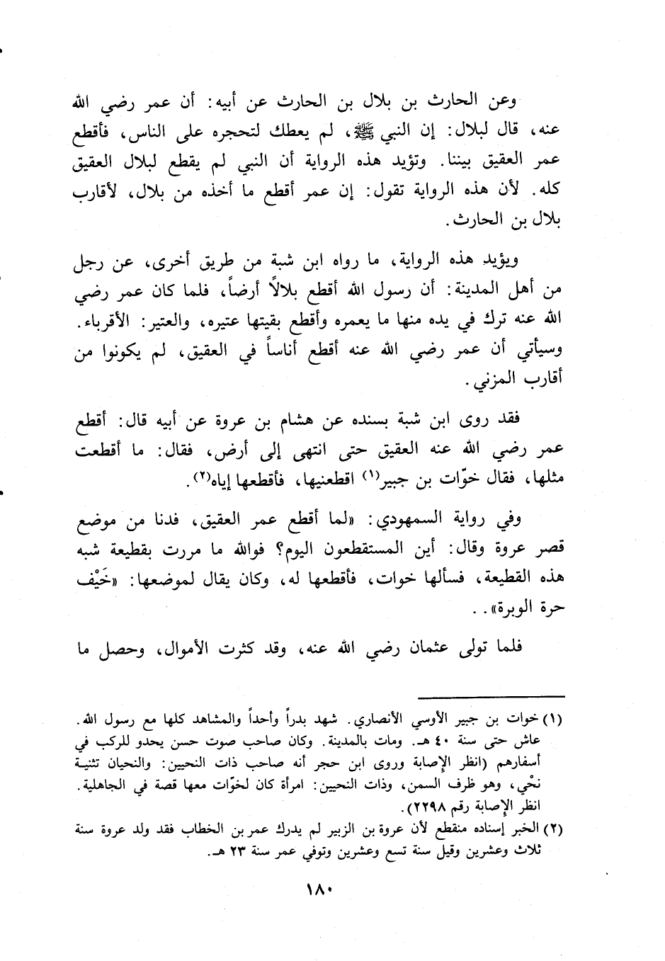 فقد روى ابن شبة بسنده عن هشام بن عروة عن أبيه قال: أقطع عمر رضي الله عنه العقيق حتى انتهى إلى أرض، فقال: ما اقطعت مثلها، فقال خوات بن جبير (1) اقطعينها، فأقطعها إياه (2).