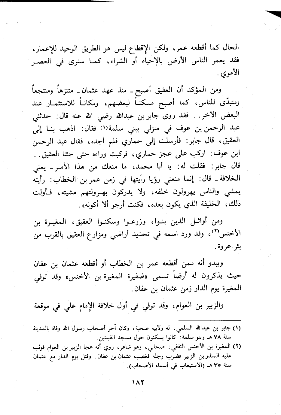 ومن المؤكد أن العقيق أصبح _ منذ عهد عثمان _ متنزهاً ومنتجعاً ومتبدى للناس، كما أصبح مسكناً لبعضهم، ومكاناً للاشتثمار عند البعض الآخر .. فقد روى جابر بن عبد الله رضي الله عنه قال: حدثني عبد الرحمن بن عوف في منزلي ببني سلمة (1) فقال: اذهي بنا إلى العقيق، قال جابر: فأرسلت إلى حماري فلم أجده، فقال عبد الرحمن ابن عوف: اركب على عجز حماري، فركبت وراءه حتى جئنا العقيق .. قال جابر: فقلت له: يا أبا محمد، ما منعك من هذا الأمر _ يعني الخلافة _ قال: إنما منعني رؤيا رأيتها في زمن عمر بن الخطاب: رأيته يمشي والناس يهرولون خلفه، ولا يدركون بهرولتهم مشيته، فأولت ذلك، الخليفة الذي يكون بعده، فكنت ارجو ألا أكونه)).