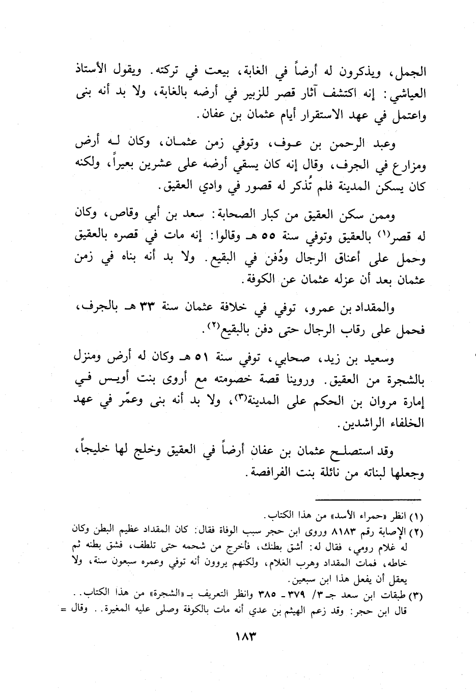وعبد الرحمن بن عوف، وتوفي زمن عثمان، وكان له أرض ومزارع في الجرف، وقال إنه كان يسقي أرضه على عشرين بعيراً، ولكنه كان يسكن المدينة فلم تذكر له قصور في وادي العقيق.