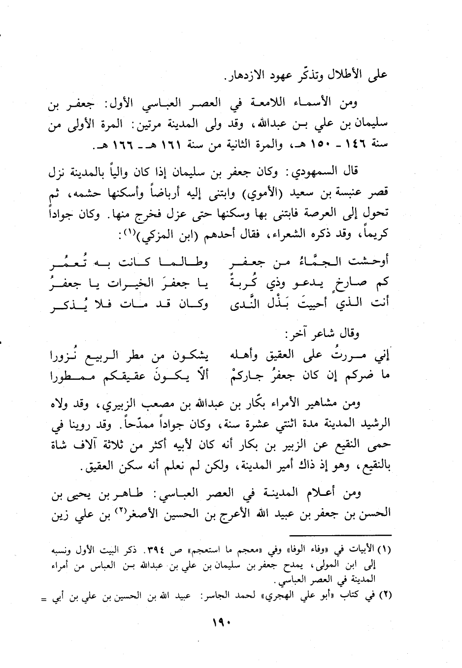 ذكر البيت الأول ونسبه إلى ابن المولى، يمدح جعفر بن سليمان بن علي بن عبد الله بن العباس من أمراء المدينة في العصر العباسي.