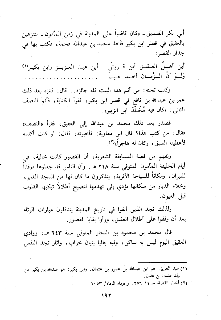 أبي بكر الصديق _ وكان قاضياً على المدينة في زمن المأمون _ متنزهين بالعقيق في قصر ابن بكير فأخذ محمد بن عبد الله فحمة، فكتب بها في جدار القصر: