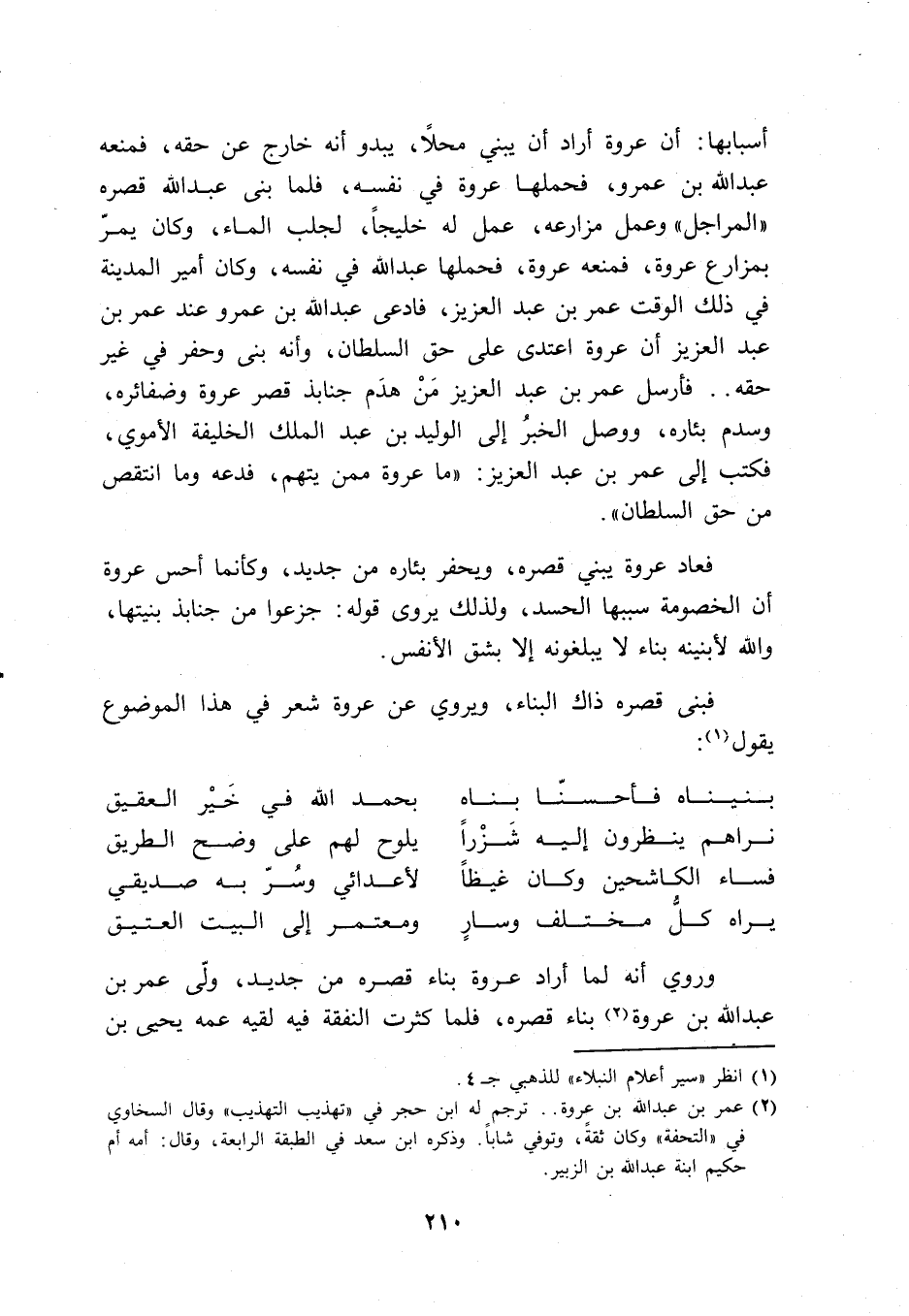 وروي أنه لما أراد عروة بناء قصره من جديد، ولى عمر بن عبد الله بن عروة (2) بناء قصره، فلما كثرت النفقة فيه لقيه عمه يحيى بن ...