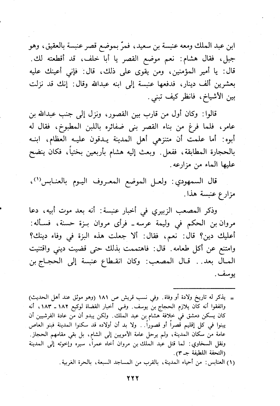 ابن عبد الملك ومعه عنبسة بن سعيد، فمر بموضع قصر عنبسة بالعقيق، وهو جبل، فقال هشام: نعم موضع القصر يا أبا خلف، قد أقطعته لك.