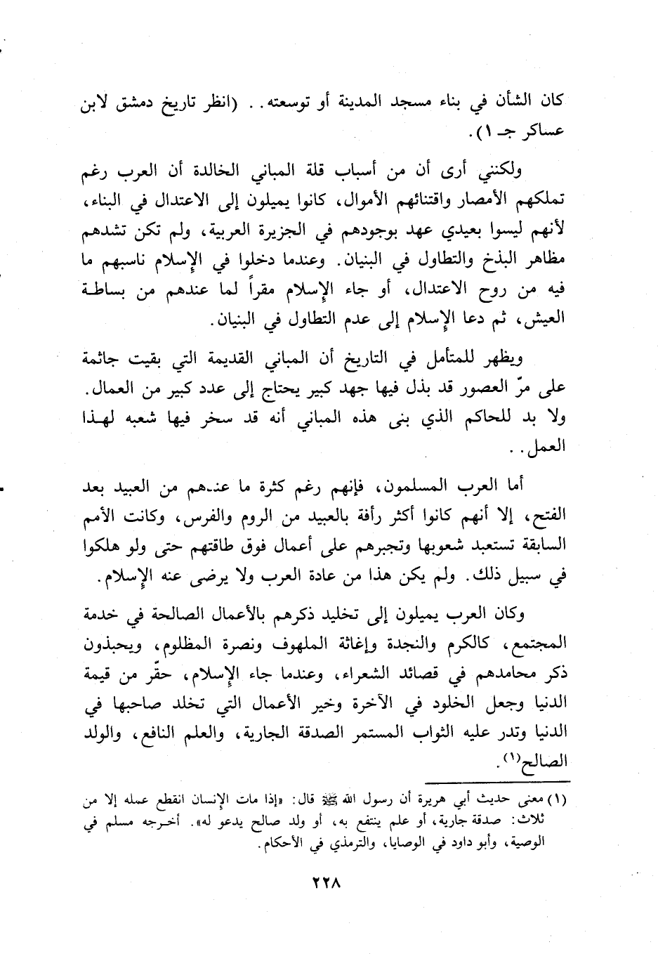 ولكنني أرى أن من أسباب قلة المباني الخالدة أن العرب رغم تملكهم الأمصار واقتنائهم الأموال، كانوا يميلون إلى الاعتدال في البناء، لأنهم ليسوا بعيدي عهد بوجودهم في الجزيرة العربية، ولم تكن تشدهم مظاهر البذخ والتطاول في البنيان.
