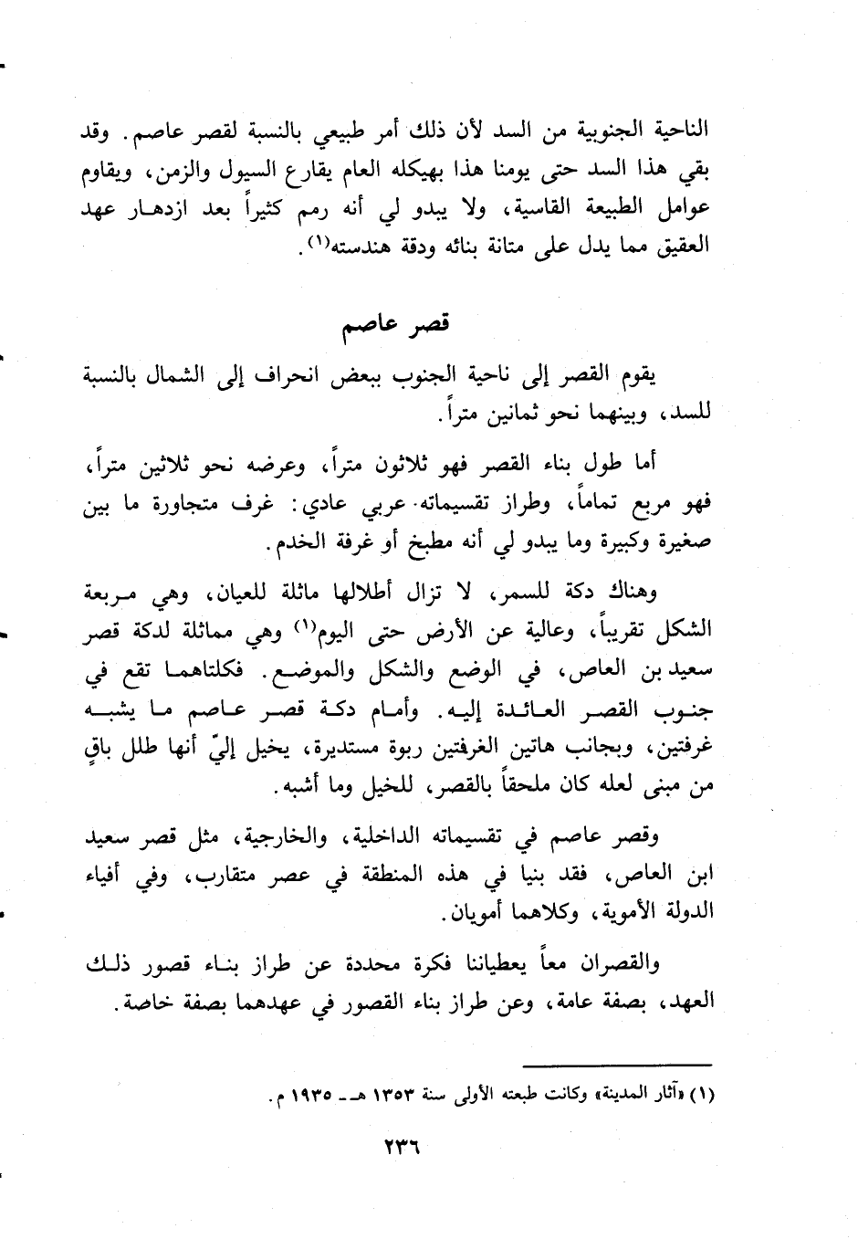 أما طول بناء القصر فهو ثلاثون متراً، وعرضه نحو ثلاثين متراً، فهو مربع تماماً، وطراز تقسيماته عربي عادي: غرف متجاورة ما بين صغيرة وكبيرة وما يبدو لي أنه مطبخ أو غرفة الخدم.