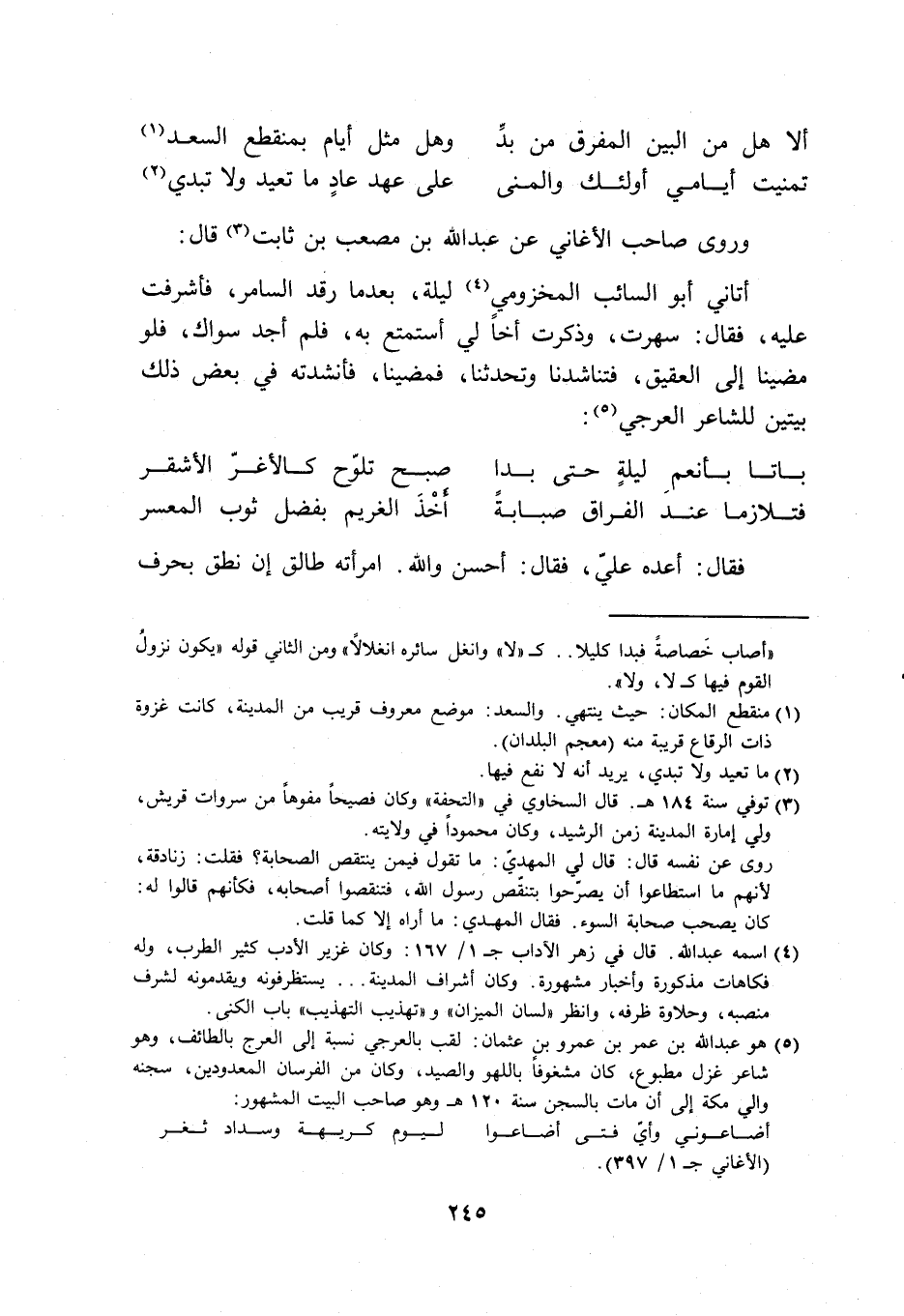 وروى صاحب الأغاني عن عبد الله بن مصعب بن ثابت (3) قال: أتاني أبو السائب المخزومي (4) ليلة، بعدما رقد السامر، فأشرفت عليه، فقال: سهرت، وذكرت أخاً لي أستمتع به، فلم أجد سواك، فلو مضينا إلى العقيق، فتناشدنا وتحدثنا، فمضينا، فأنشدته في بعض ذلك بيتين للشاعر العرجي (5):