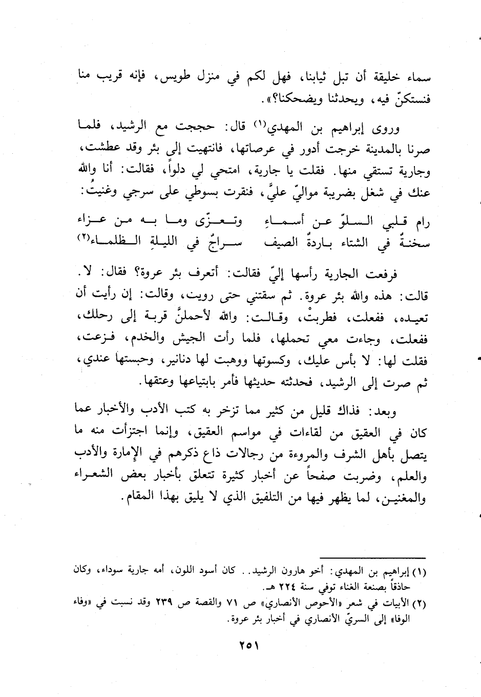 (2) الأبيات في شعر ((الأحوص الأنصاري)) ص 71 والقصة ص 239 وقد نسبت في ((وفاء الوفا)) إلى السريّ الأنصاري في أخبار بئر عروة.