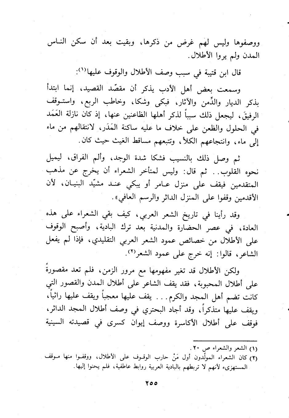 وقد رأينا في تاريخ الشعر العربي، كيف بقي الشعراء على هذه العادة، في عصر الحضارة والمدينة بعد ترك البادية، وأصبح الوقوف على الأطلال من خصائص عمود الشعر العربي التقليدي، فإذا لم يفعل الشاعر، قالوا: إنه خرج على عمود الشعر (2).