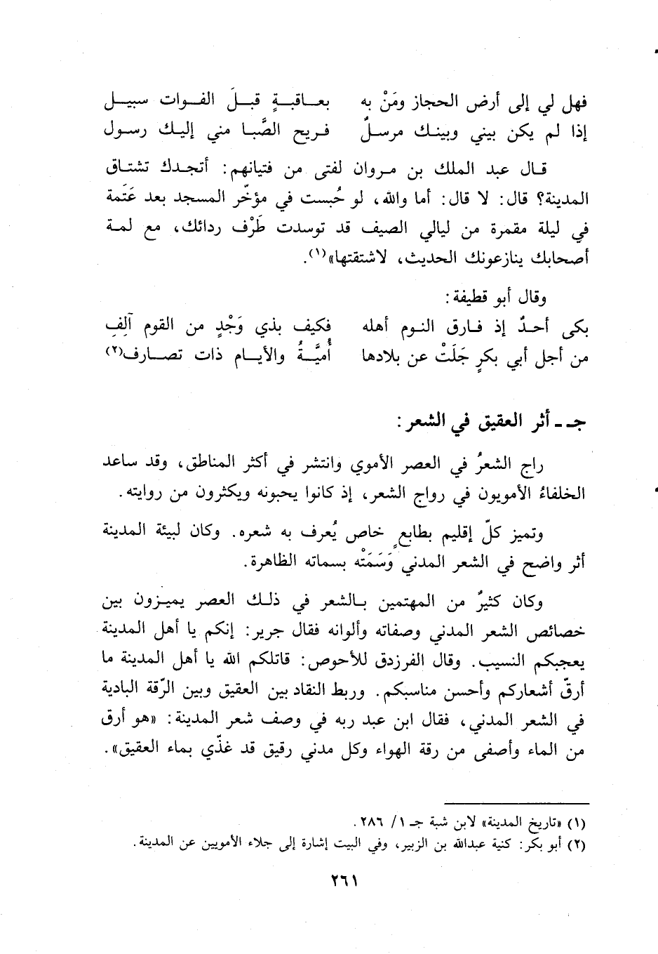 وكان كثير من المهتمين بالشعر في ذلك العصر يميزون بين خصائص الشعر المدني وصفاته وألوانه فقال جرير: إنكم يا أهل المدينة يعجبكم النسيب.