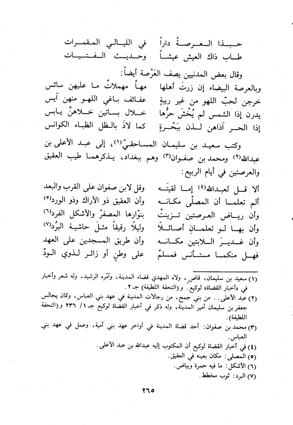 وكتب سعيد بن سليمان المساحقي (1)، إلى عبد الأعلى بن عبد الله (2) ومحمد بن صفوان (3) وهم ببغداد، يذكرهما طيب العقيق والعرصتين في أيام الربيع: