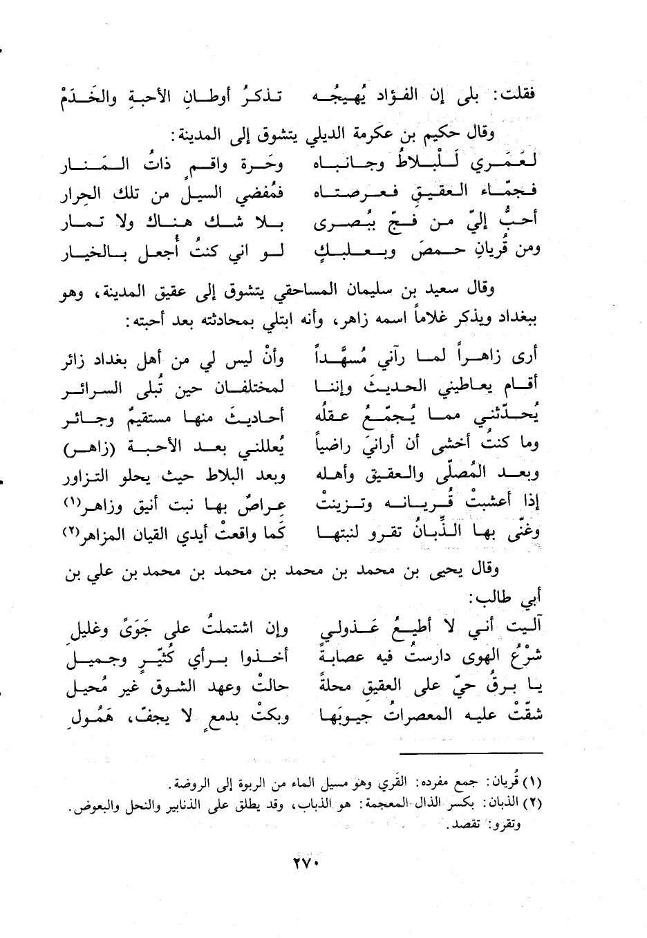 وقال سعيد بن سليمان المساحقي يتشوق إلى عقيق المدينة، وهو ببغداد ويذكر غلاماً اسمه زاهر، وأنه ابتلي بمحادثته بعد أحبته: