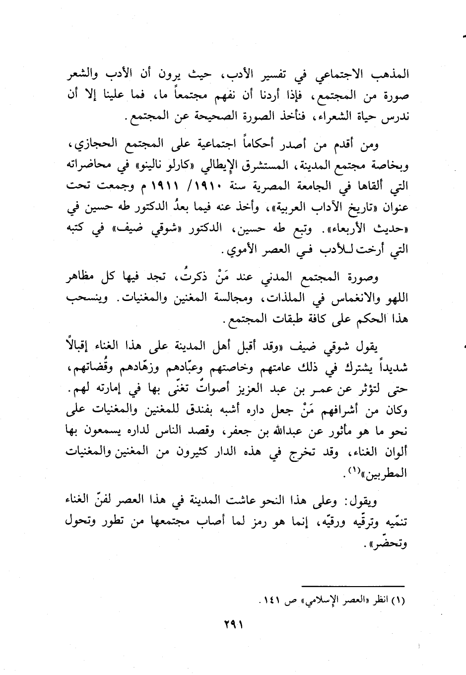 ويقول: وعلى هذا النحو عاشت المدينة في هذا العصر لفن الغناء تنميه وترقّيه ورقيّه، إنما هو رمز لما أصاب مجتمعها من تطور وتحول وتحضيّر)).