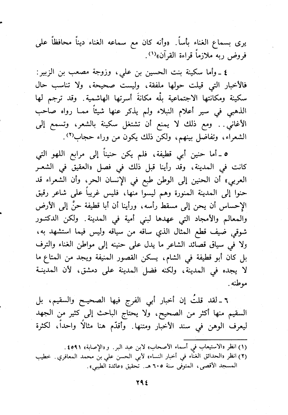 4 - وأما سكينة بنت الحسين بن علي، وزوجة مصعب بن الزبير: فالأخبار التي قيلت حولها ملفقة، وليست صحيحة، ولا تناسب حال سكينة ومكانتها الاجتماعية بله مكانة أسرتها الهاشمية. وقد ترجم لها الذهبي في سير أعلام النبلاء ولم يذكر عنها شيئاً مما رواه صاحب الأغاني .. ومع ذلك لا يمنع أن تشتغل سكينة بالشعر، وتسمع إلى الشعراء، وتفاضل بينهم، ولكن ذلك يكون من وراء حجاب (2).