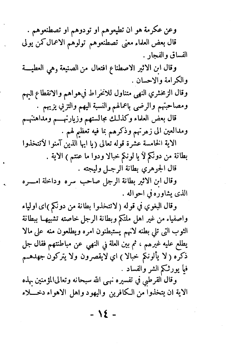 وقال القرطبي في تفسيره: نهى الله سبحانه وتعالى المؤمنين بهذه الآية أن يتخذوا من الكافرين واليهود وأهل الأهواء دخلاء