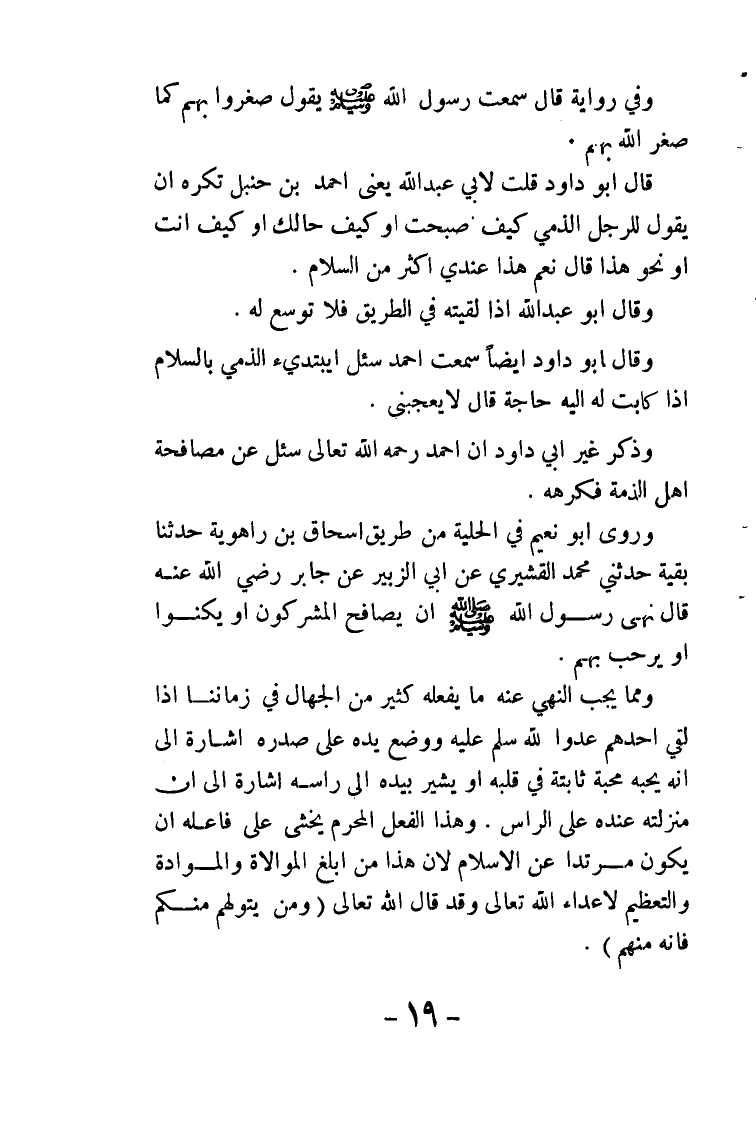 وفي رواية قال: سمعت رسول الله - صلى الله عليه وسلم - يقول: (صغروا بهم كما صغر الله بهم). قال أبو داود: قلت لأبي عبد الله يعني أحمد بن حنبل: تكره أن يقال للرجل الذمي كيف أصبحت أو كيف حالك أو كيف أنت أو نحو هذا؟ قال: نعم، هذا عندي أكثر من السلام. وقال أبو عبد الله: إذا لقيته في الطريق فلا توسع له.