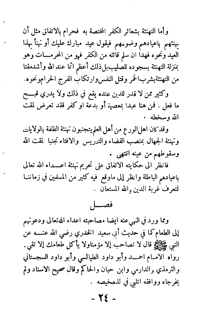 فانظر إلى حكايته الاتفاق على تحريم تهنئة أعداء الله تعالى بأعيادهم الباطلة وانظر إلى ما وقع فيه كثير من المسلمين في زماننا لتعرف غربة الدين والله المستعان.