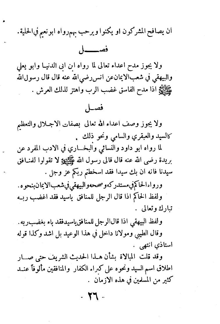 ولا يجوز وصف أعداء الله تعالى بصفات الإجلال والتعظيم كالسيد، والعبقري، والسامي ونحو ذلك، لما رواه أبو داود والنسائي والبخاري في الأدب المفرد عن بريدة رضي الله عنه قال: قال رسول الله - صلى الله عليه وسلم -: (لا تقولوا للمنافق سيدنا فإنه إن يكن سيدا فقد أسخطتم ربكم عز وجل) ورواه الحاكم في مستدركه وصححه، ورواه البيهقي في شعب الإيمان بنحوه. ولفظ الحاكم: (إذا قال الرجل للمنافق يا سيد فقد أغضب ربه تبارك وتعالى). ولفظ البيهقي: (إذا قال الرجل للمنافق ياسيد فقد باء بغضب ربه). قال الطيبي: ومولانا داخل في هذا الوعيد بل أشد وكذا قوله أستاذي اهـ.