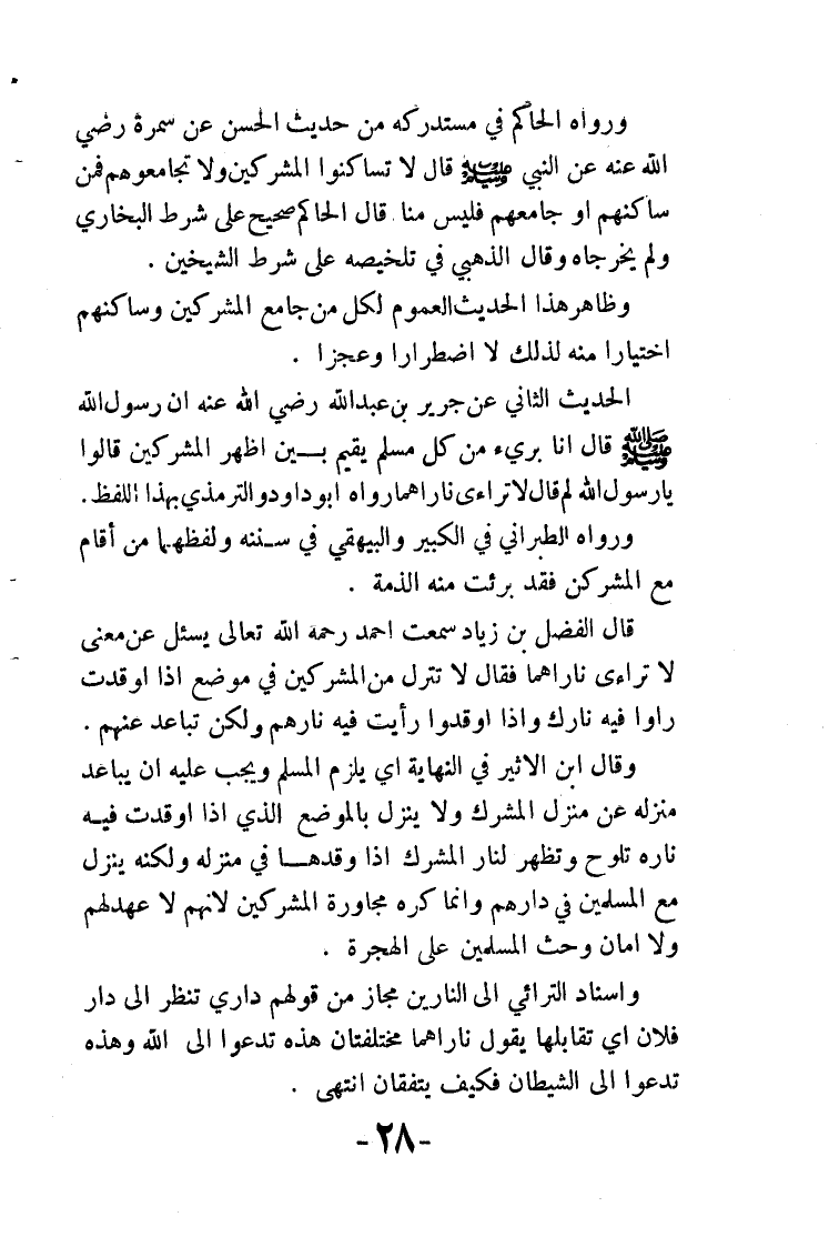 الحديث الثاني: عن جرير بن عبد الله رضي الله عنه أن رسول الله - صلى الله عليه وسلم - قال: (أنا بريء من كل مسلم يقيم بين أظهر المشركين) قالوا يا رسول الله: ِلم؟ قال: (لا تراءى ناراهما) رواه أبو داود والترمذي بهذا اللفظ، ورواه الطبراني في الكبير والبيهقي في سننه ولفظهما: (من أقام مع المشركين فقد برأت منه الذمة). قال الفضل بن زياد: سمعت أحمد رحمه الله تعالى يُسأل عن معنى لا تراءى ناراهما فقال: لا تنزل من المشركين في موضع إذا أوقدت رأوا فيه نارك وإذا أوقدوا رأيت فيه نارهم ولكن تباعد عنهم اهـ. وقال ابن الأثير في النهاية: أي يلزم المسلم ويجب عليه أن يباعد منزله عن منزل المشرك ولا ينزل بالموضع الذي إذا أوقدت فيه ناره تلوح وتظهر لنار المشرك إذا أوقدها في منزله ولكنه ينزل مع المسلمين في دارهم وإنما كره مجاورة المشركين لأنهم لا عهد لهم ولا أمان وحث المسلمين على الهجرة. وإسناد الترائي إلى النارين مجاز من قولهم: داري تنظر إلى دار فلان. أي تقابلها يقول: ناراهما مختلفتان، هذه تدعو إلى الله وهذه تدعو إلى الشيطان فكيف يتفقان اهـ.
