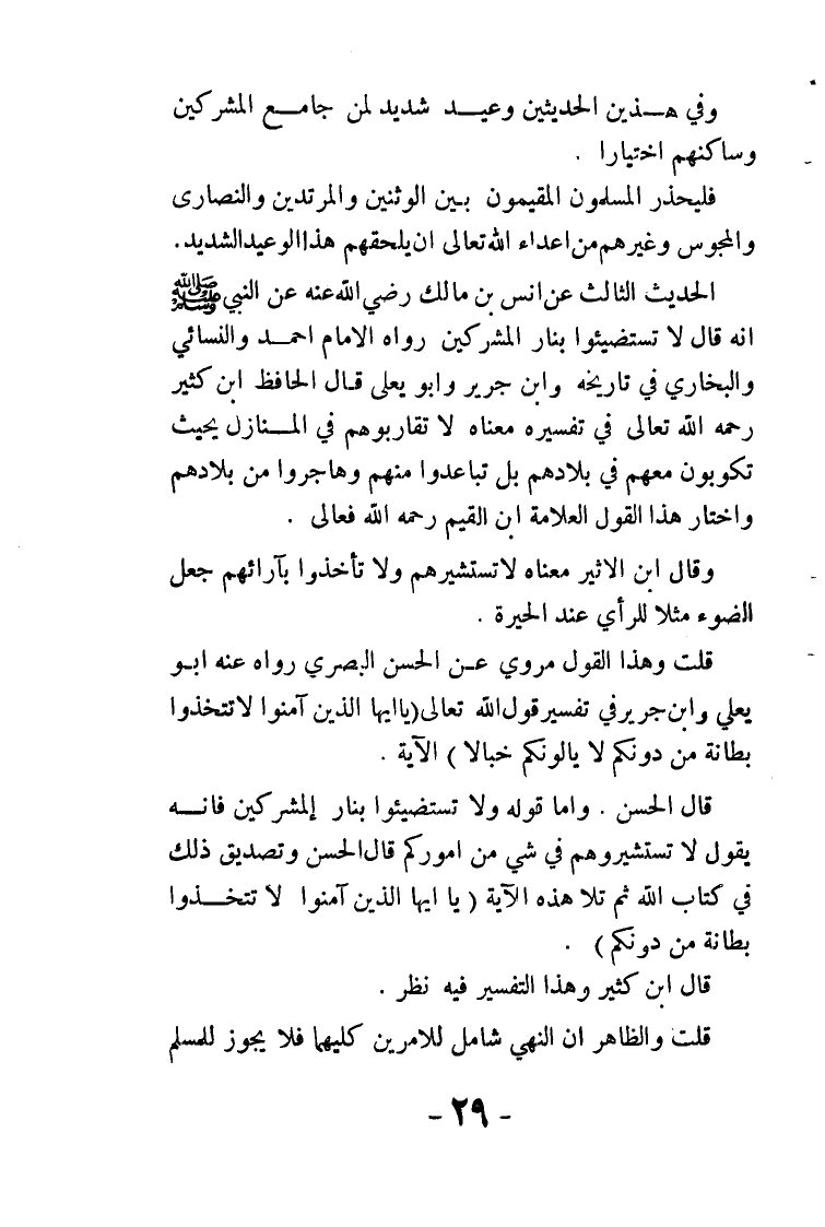 قلت: وهذا القول مروي عن الحسن البصري رواه عنه أبو يعلى وابن جرير في تفسير قوله تعالى: {ياأيها الذين آمنوا لا تتخذوا بطانة من دونكم لا يألونكم خبالا} قال الحسن: وأما قوله ولا تستضيئوا بنار المشركين فإنه يقول لا تستشيروهم في شيء من أموركم قال الحسن: وتصديق ذلك في كتاب الله ثم تلا هذه الآية: {يا أيها الذين آمنوا لا تتخذوا بطانة من دونكم}. قال ابن كثير: وهذا التفسير فيه نظر.