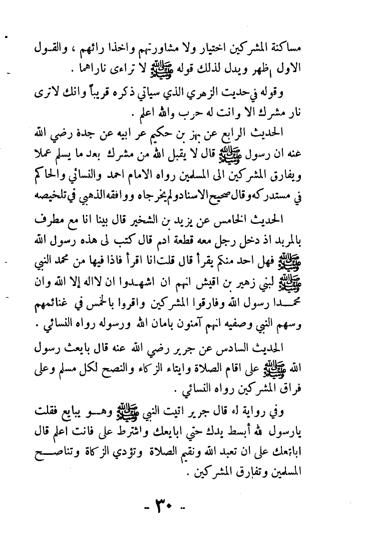 الحديث السادس: عن جرير رضي الله عنه قال: بايعت رسول الله - صلى الله عليه وسلم - على إقام الصلاة وإيتاء الزكاة والنصح لكل مسلم وعلى فراق المشركين. رواه النسائي. وفي رواية له قال جرير: أتيت النبي - صلى الله عليه وسلم - وهو يبايع، فقلت: يا رسول الله ابسط يدك حتى أبايعك واشترط علي فأنت أعلم، قال: (أبايعك على أن تعبد الله وتقيم الصلاة وتؤدي الزكاة وتناصح المسلمين وتفارق المشركين).