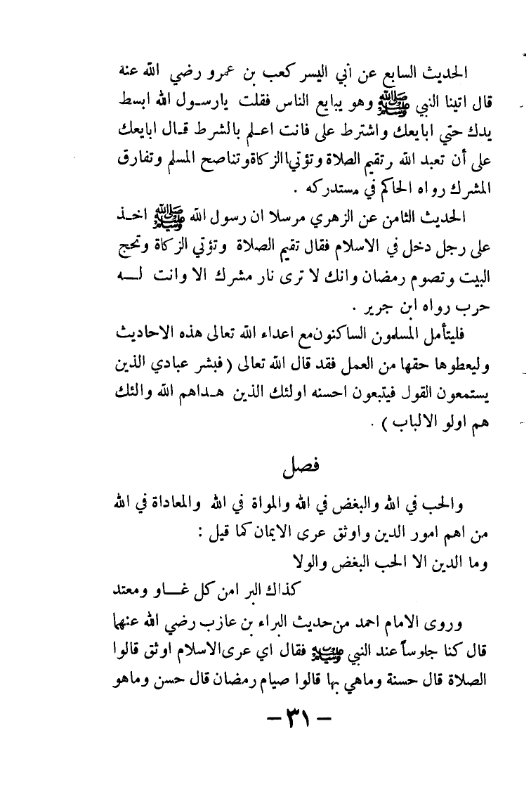 الحديث السابع: عن أبي اليسر كعب بن عمرو رضي الله عنه قال: أتينا النبي - صلى الله عليه وسلم - وهو يبايع الناس فقلت: يا رسول الله ابسط يدك حتى أبايعك واشترط علي فأنت أعلم بالشرط، قال: (أبايعك على أن تعبد الله وتقيم الصلاة وتؤتي الزكاة وتناصح المسلم وتفارق المشرك) رواه الحاكم في مستدركه.