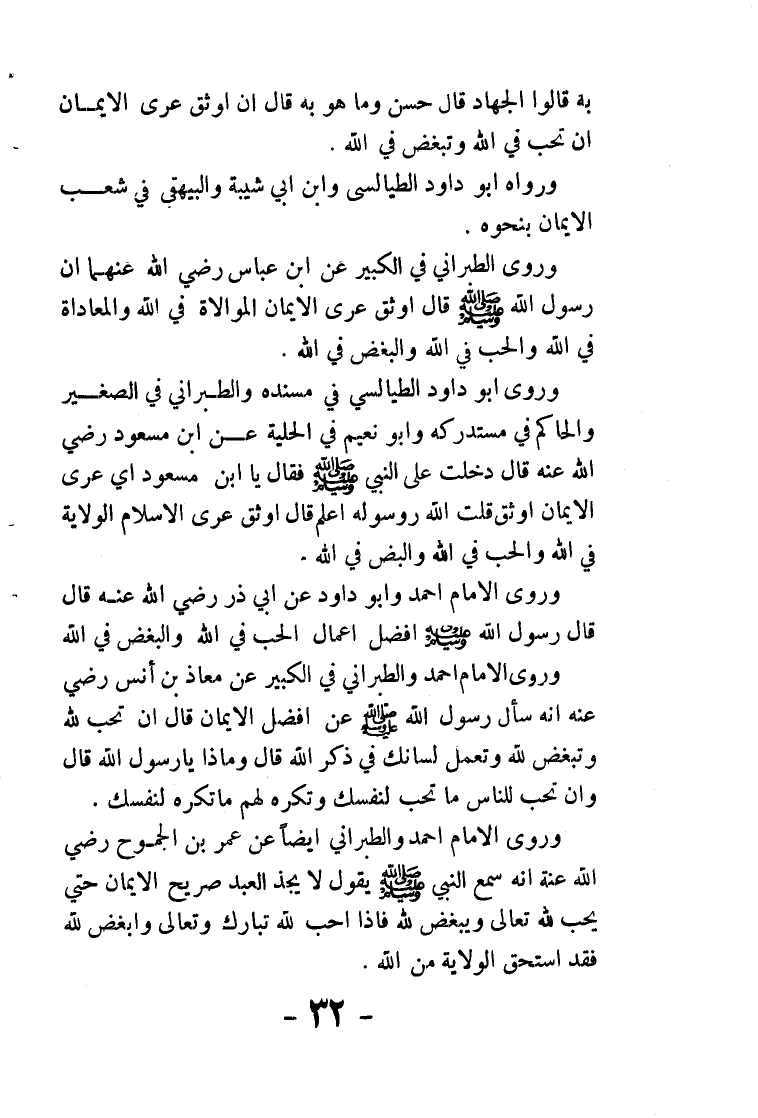 به) قالوا: الجهاد. قال: (حسن وما هو به) قال: (إن أوثق عرى الإيمان أن تحب في الله وتبغض في الله). ورواه أبو داود الطيالسي وابن أبي شيبة والبيهقي في شعب الإيمان بنحوه. وروى الطبراني في الكبير عن ابن عباس رضي الله عنهما أن رسول الله - صلى الله عليه وسلم - قال: (أوثق عرى الإيمان، الموالاة في الله والمعاداة في الله والحب في الله والبغض في الله).