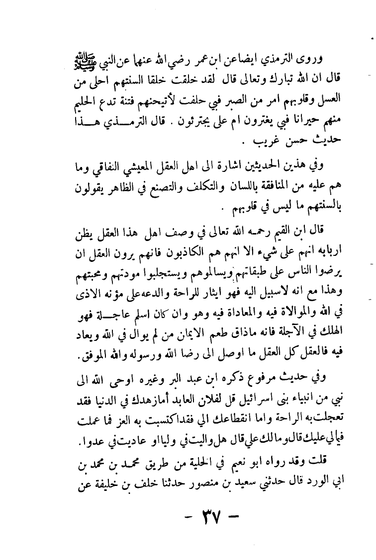 قال ابن القيم رحمه الله تعالى في وصف أهل هذا العقل: يظن أربابه أنهم على شيء ألا إنهم هم الكاذبون، فإنهم يرون العقل أن يرضوا الناس على طبقاتهم ويسالموهم ويستجلبوا مودتهم ومحبتهم وهذا مع أنه لا سبيل إليه فهو إيثار للراحة والدعة على مؤنة الأذى في الله والموالاة فيه والمعاداة فيه وهو وإن كان أسلم عاجلة فهو الهلك في الآجلة فإنه ما ذاق طعم الإيمان من لم يوال في الله ويعاد فيه فالعقل كل العقل ما أوصل إلى رضا الله ورسوله والله الموفق اهـ.