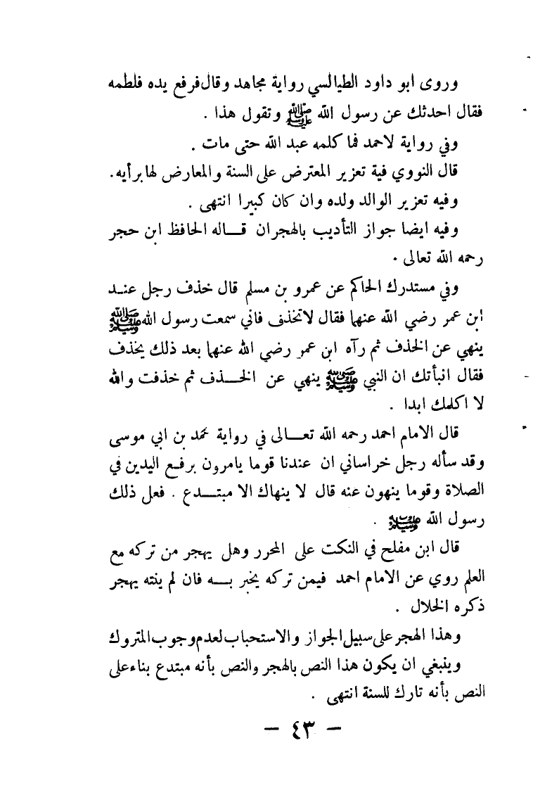 وفي مستدرك الحاكم عن عمرو بن مسلم قال: خذف رجل عند ابن عمر رضي الله عنهما فقال: لا تخذف فإني سمعت رسول الله - صلى الله عليه وسلم - ينهى عن الخذف ثم رآه ابن عمر رضي الله عنهما بعد ذلك يخذف فقال: أنبأتك أن النبي - صلى الله عليه وسلم - ينهى عن الخذف ثم خذفت، والله لا أكلمك أبدا. قال الإمام أحمد رحمه الله تعالى في رواية محمد بن أبي موسى وقد سأله رجل خراساني أن عندنا قوما يأمرون برفع اليدين في الصلاة وقوما ينهون عنه، قال: لا ينهاك إلا مبتدع، فعل ذلك رسول الله - صلى الله عليه وسلم -. قال ابن مفلح في النكت على المحرر: وهل يهجر من تركه مع العلم؟ روي عن الإمام أحمد فيمن تركه يخبر به فإن لم ينته يهجر، ذكره الخلال. وهذا الهجر على سبيل الجواز والاستحباب لعدم وجوب المتروك وينبغي أن يكون هذا النص بالهجر والنص بأنه مبتدع بناء على النص بأنه تارك للسنة اهـ.